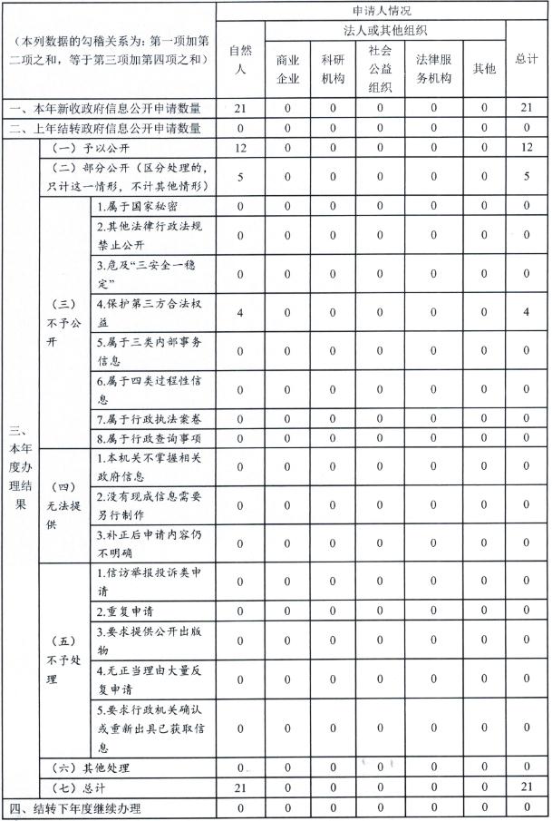 (二)依申請公開情況。依法、依規辦理依申請公開信息21件,辦結及時率100%,其中予以公開12件,部分公開5件,不予公開4件,無法提供0條,無法處理0條。2019年我機關未發生因政府信息公開被申請行政復議、被提起行政訴訟的情況。