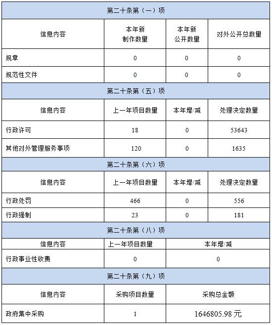 (一)主動公開情況。全年依托石獅市政府信息公開平臺公開主動公開政府信息20條,其中機構設置5條、規劃計劃4條、應急管理4條、食品藥品和產品質量的監督檢查情況4條、應主動公開的其他政府信息公開3條。主動公開行政許可信息53643條、行政處罰信息556條。