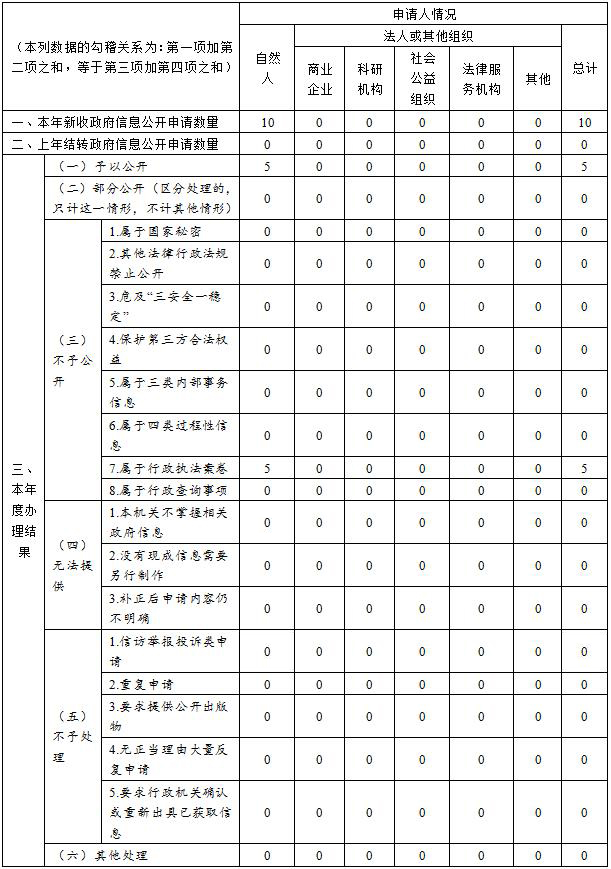 (二)依申請公開情況。依法、依規辦理依申請公開信息10件,辦結及時率100%,其中予以公開5件,部分公開0件,不予公開5件,無法提供0條,無法處理0條。2020年我單位未發生因政府信息公開被申請行政復議、被提起行政訴訟的情況。