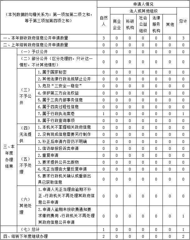 (二)依申請公開情況。依法、依規辦理依申請公開信息3件,辦結及時率100%,其中予以公開0件,部分公開0件,不予公開1件,無法提供0條,無法處理0條,結轉下年度2件。2021年我單位未發生因政府信息公開被申請行政復議、被提起行政訴訟的情況。