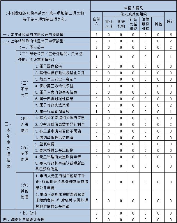 (二)依申請公開情況。暢通依申請公開受理渠道,依法保障公眾合理的信息需求,嚴格按照法定時限答復。本年度共收到依申請公開信息6件,去年結轉2件,辦結及時率100%。2022年我單位未發生因政府信息公開被申請行政復議、被提起行政訴訟的情況。