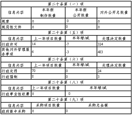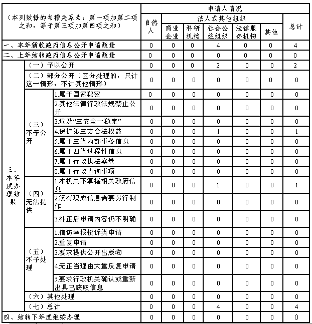 (二)依申請(qǐng)公開情況。2020年,收到政府信息公開申請(qǐng)4次,其中屬我局掌握政府信息2項(xiàng),已按時(shí)答復(fù)辦結(jié);另1項(xiàng)“涉及商業(yè)秘密、個(gè)人隱私等公開會(huì)對(duì)第三方合法權(quán)益造成損害的政府信息,行政機(jī)關(guān)不得公開”,我局不予公開;另1項(xiàng)“非政府信息”,及時(shí)告知申請(qǐng)人向相關(guān)單位申請(qǐng)。因政府信息公開被申請(qǐng)行政復(fù)議2件,上級(jí)部門裁定結(jié)果維持。因政府信息被提起行政訴訟2件,尚未審結(jié)。