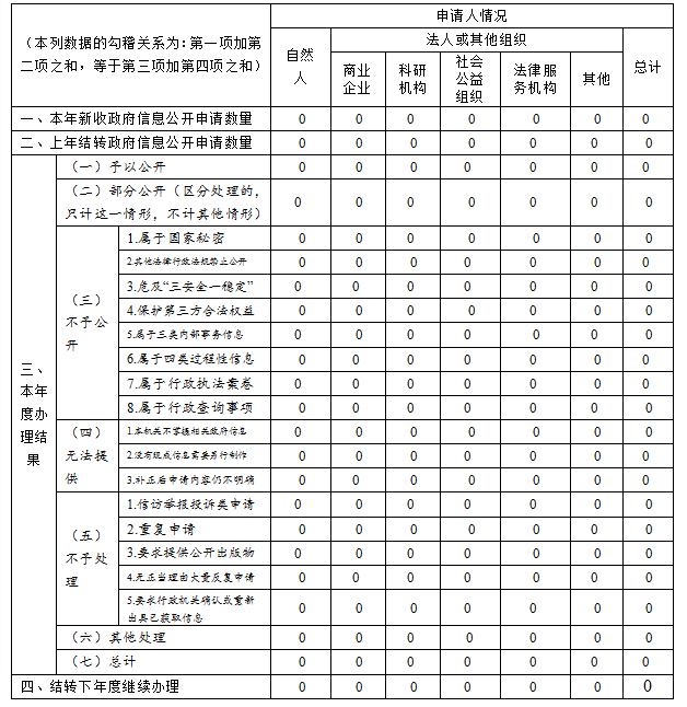 截至2019年底,我局未收到公民、法人和其他組織提出的申請(qǐng)。我局未因政府信息公開(kāi)被提起行政復(fù)議及行政訴訟情況。