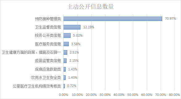 2022年度,重點對衛(wèi)生健康方面信息進行公開,其中衛(wèi)生健康方面的政策、措施及其實施情況類信息7條,占2.51%;院務(wù)公開類信息14條,占5.02%;衛(wèi)生監(jiān)督類信息34條,占12.19%;醫(yī)療服務(wù)類信息10條,占3.58%;預(yù)防接種管理類信息198條,占70.97%;疾病應(yīng)急救助類信息4條,占1.43%;飲用水衛(wèi)生安全類信息4條,占1.43%;疫苗監(jiān)管類信息6條,占2.15%;公立醫(yī)療衛(wèi)生機構(gòu)績效考核類信息2條,占0.72%。積極通過石獅市人民政府門戶網(wǎng)站、“石獅市衛(wèi)生健康局”微信公眾號、《石獅日報》、政務(wù)公開欄等方式及時解讀衛(wèi)生健康工作相關(guān)政策,在石獅市人民政府門戶網(wǎng)站解讀《關(guān)于適用<醫(yī)師法>和<醫(yī)療機構(gòu)管理條例>行政處罰自由裁量權(quán)基準(zhǔn)(試行)》。