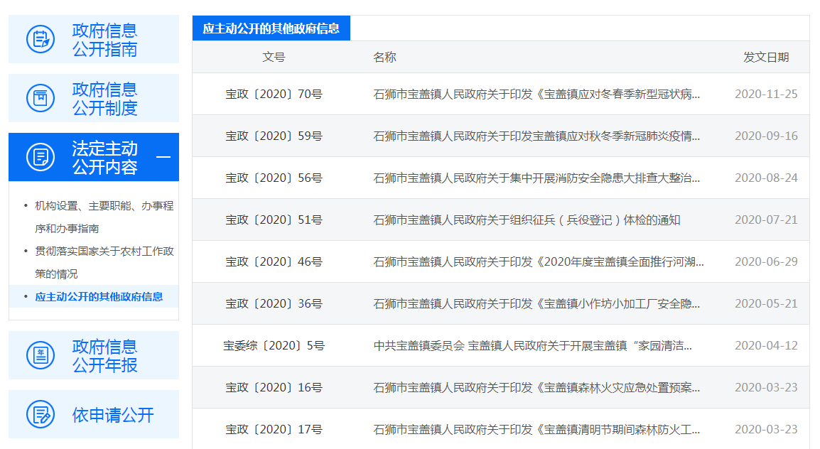 (五)深化重點領域公開。根據《寶蓋鎮人民政府政務公開事項標準目錄》涉及的財政預決算、社會救助、養老服務、義務教育等19個領域,通過石獅市人民政府網、鎮村兩級微信公眾號及公示欄、村情大事記平臺及時公開寶蓋鎮權責清單、2020年度績效目標、2020年人大代表建議答復、2020年財政預算及2019年財政決算、《寶蓋鎮突發公共衛生事件應急預案》、《寶蓋鎮森林火災應急處置預案》、《寶蓋鎮應對秋冬季新冠肺炎疫情應急預案》、《中共寶蓋鎮委員會 寶蓋鎮人民政府關于確定2020年寶蓋鎮部分計劃生育家庭獎勵扶助金發放對象的通知》等重點領域信息。