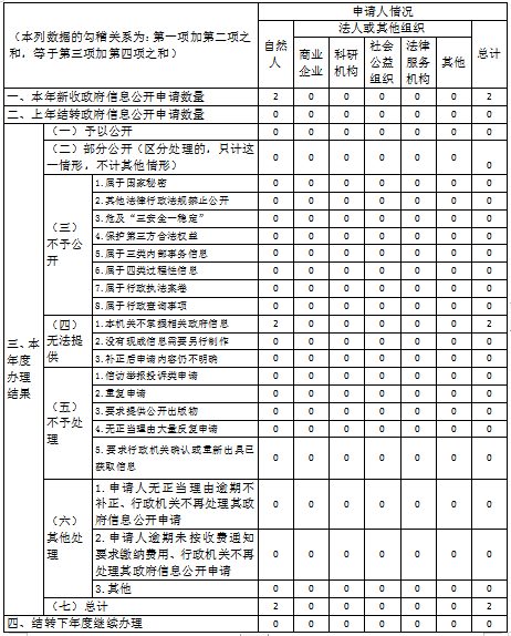 (二)做好依申請公開政府信息辦理工作。2021年共收到政府信息公開申請2件(歷年累計數量2件),其中:當面申請0件,以網上提交表單形式申請0件,其他形式申請2件。該2件政府信息公開申請的申請人類別為自然人,反饋意見皆屬于“不屬于本機關掌握相關政府信息”,目前2件申請公開已辦結。
