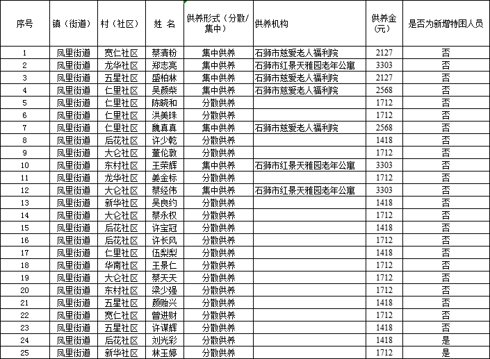鳳里街道2025年5月特困人員保障金花名冊