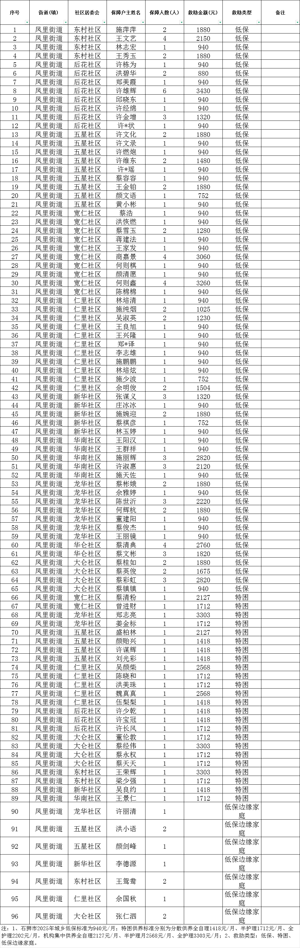 鳳里街道2025年6月享受低收入家庭待遇名單