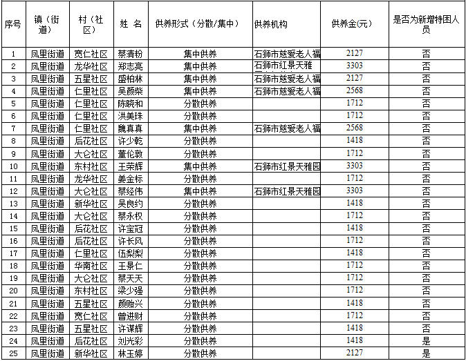 鳳里街道2025年6月特困人員保障金花名冊
