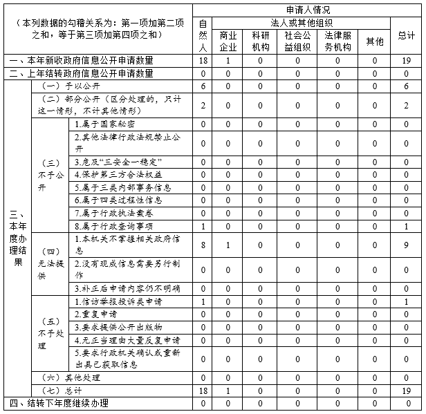 (二)依申請信息公開情況。2019年,我辦共受理依申請公開19件,申請人為自然人18個以及商業企業1家,受理方式為信函申請10件、網絡申請9件,主要涉及安征遷、工程項目等方面,其中“予以公開”6件;“部分公開”2件;“不予公開”1件,屬于行政查詢事項;“無法提供”9件,主要是我辦不掌握相關政府信息;“不予處理”1件,主要是申請人以政府信息公開申請形式提出與政府信息公開無關訴求。2019年,我辦未發生因政府信息公開被申請行政復議、被提起行政訴訟情況。