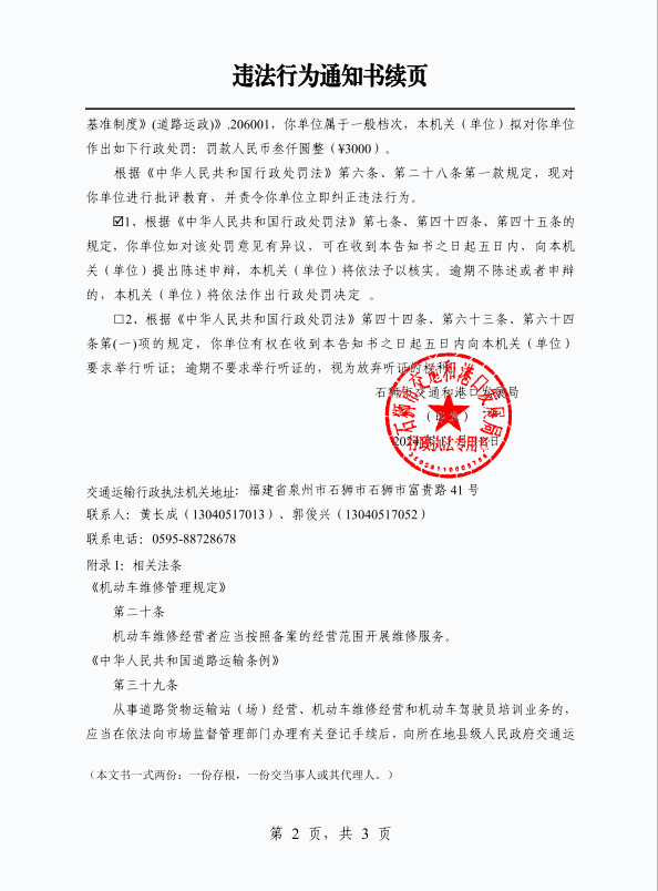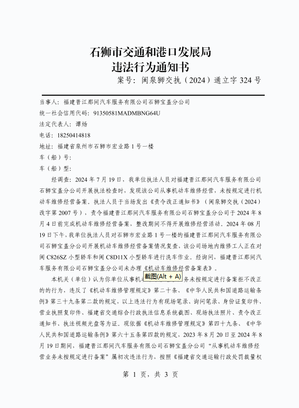 附件:《石獅市交通和港口發展局違法行為通知書》(閩泉獅交執〔2024〕通立字324號)