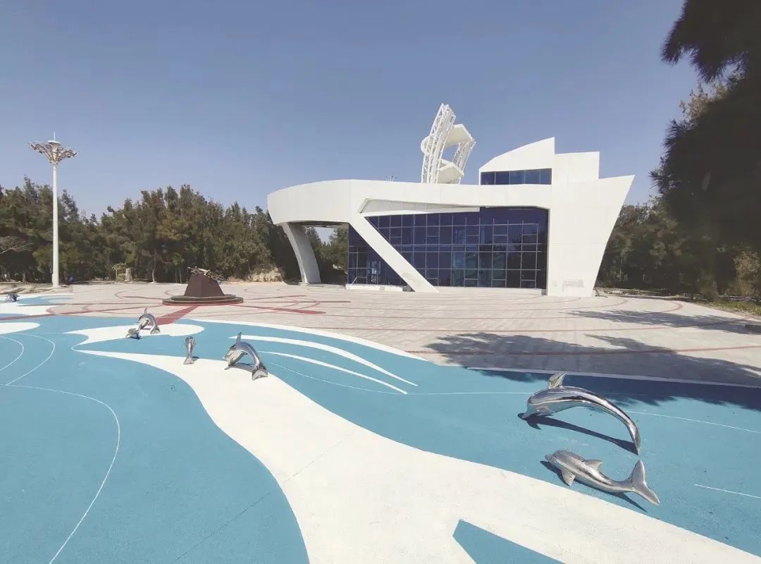 去年底主體已完工的軍事公園游客服務中心,室外廣場近期又有些許變化。在靠海的“海豚”小品區域,地面面層繪制了白浪和藍海,讓整個廣場色調更為多彩。