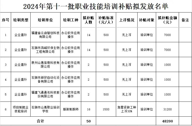 根據(jù)《福建省人力資源和社會保障廳福建省財(cái)政廳關(guān)于就業(yè)補(bǔ)助資金技能培訓(xùn)補(bǔ)貼項(xiàng)目使用職業(yè)培訓(xùn)券結(jié)算有關(guān)事項(xiàng)的通知》(閩人社文〔2023〕153號)、《福建省人力資源和社會保障廳關(guān)于印發(fā)〈職業(yè)培訓(xùn)補(bǔ)貼申報(bào)審核操作規(guī)程〉的通知》(閩人社文〔2024〕69號)、《泉州市人力資源和社會保障局 泉州市財(cái)政局轉(zhuǎn)發(fā)福建省人力資源和社會保障廳福建省財(cái)政廳關(guān)于印發(fā)職業(yè)技能提升工程有關(guān)職業(yè)技能培訓(xùn)和評價(jià)補(bǔ)貼配套政策方案的通知》(泉人社文〔2024〕124號)等文件要求,現(xiàn)經(jīng)福建省職業(yè)培訓(xùn)補(bǔ)貼管理系統(tǒng)審核通過,2024年第十一批職業(yè)技能培訓(xùn)補(bǔ)貼擬發(fā)放名單共有福建省云啟智創(chuàng)科技有限公司等6家培訓(xùn)單位符合申領(lǐng)條件,補(bǔ)貼人員合計(jì)50人,擬補(bǔ)貼金額共計(jì)4.82萬元,現(xiàn)面向社會公示(公示名單詳見附件)。