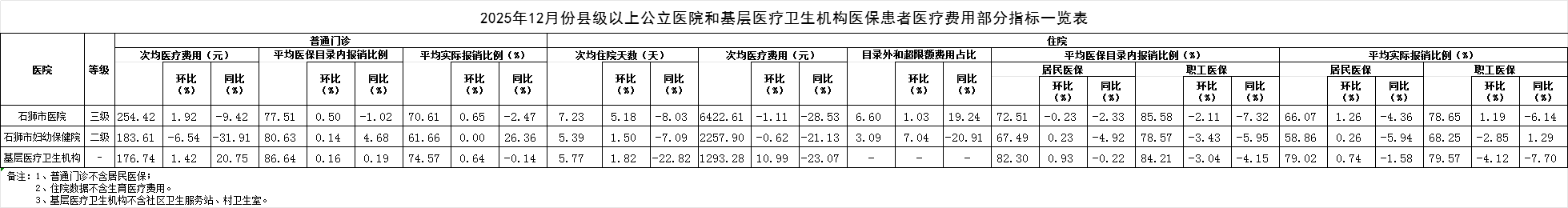 2025年12月份縣級以上公立醫院和基層醫療衛生機構醫保患者醫療費用部分指標一覽表
